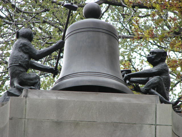 Just above the clock there is a single brass bell. Two monkeys with hammers face the bell. The clock’s action begins when the monkeys strike the bell with their hammers to count off the appropriate hour. Following the last chime of the hour, the dance of the animals begins. (At the half hour the bell is struck just once and a shorter dance ensues.)